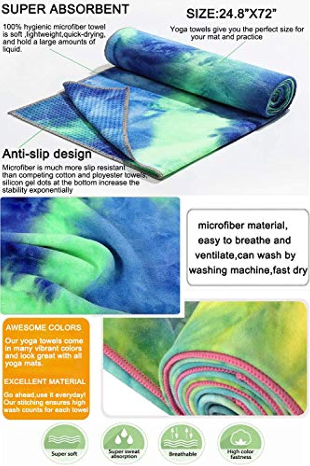 Toalla de secado rápido, antideslizante, 72 x 24.8 pulgadas, Tapete de yoga, supersuave, absorbente del sudor, antideslizante, para yoga caliente, tamaño perfecto para ejercicios de yoga, ideal para yoga caliente y pilates
